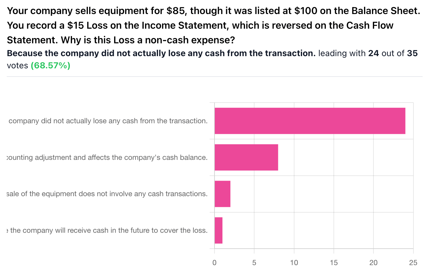 Correct Answer: A, Because the company did not actually lose any cash from the transaction. — Your company sells equipment for $85, though it was listed at $100 on the Balance Sheet. You record a $15 Loss on the Income Statement, which is reversed on the Cash Flow Statement. Why is this Loss a non-cash expense?