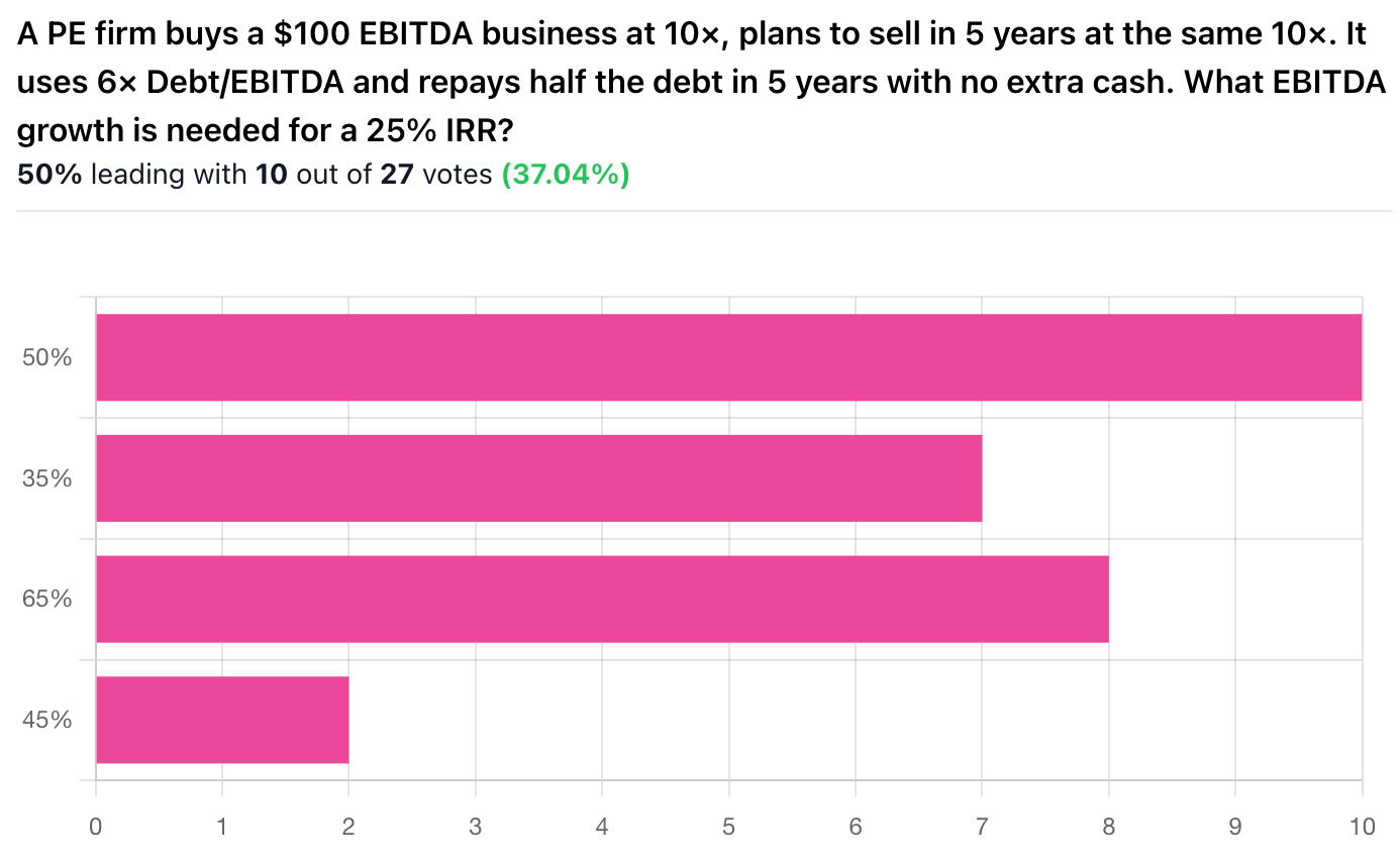 Correct Answer: A, 50% — A PE firm buys a $100 EBITDA business at 10×, plans to sell in 5 years at the same 10×. It uses 6× Debt/EBITDA and repays half the debt in 5 years with no extra cash. What EBITDA growth is needed for a 25% IRR?